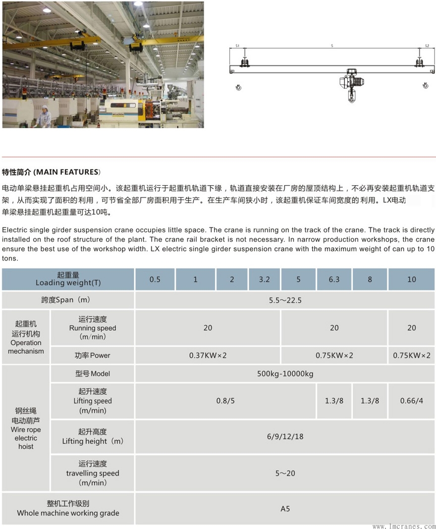 單梁超低懸掛起重機是把承重梁懸架固定不動在房屋建筑走動路軌(工型鋼)上的起重設備。走動路軌的設定處及跨距能夠隨意設置,最合適于自動生產線等處。