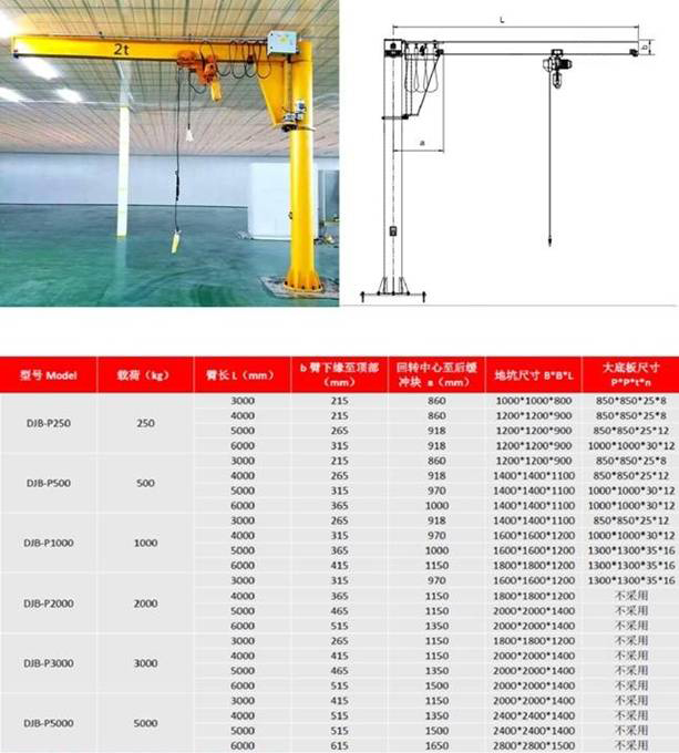 墻式旋臂吊只需簡單的安裝在墻面或立柱上,不占用地面面積;立柱式旋臂吊的立柱占地小,可以用預埋地腳螺栓或重型安卡螺栓等方式固定。如果需要,我們可以提供地腳螺栓和安裝模板。